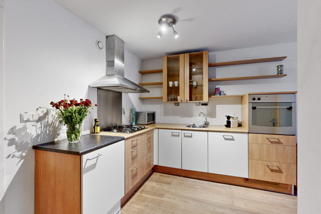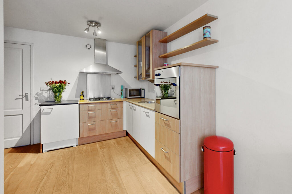 De keuken staat in een praktische hoekopstelling, met veel werk- en kastruimte en is uitgerust met een vaatwasser, oven, 4-pits gasfornuis, afzuigkap en koelkast.