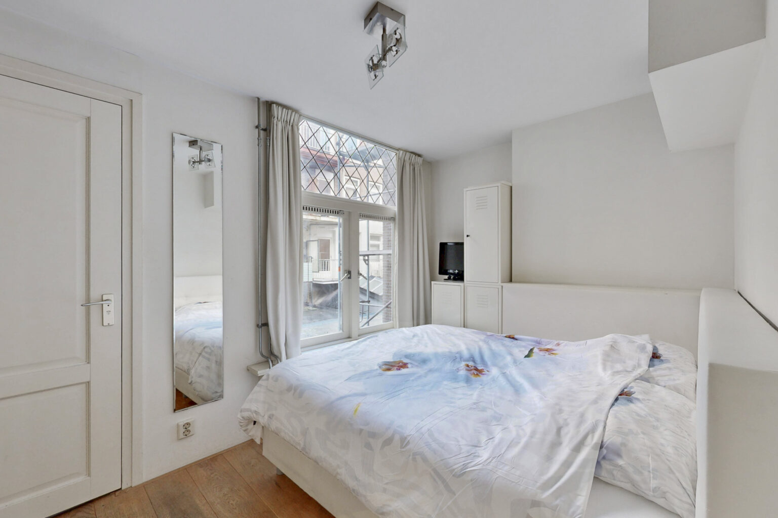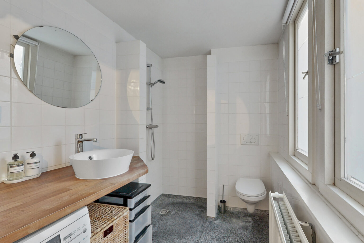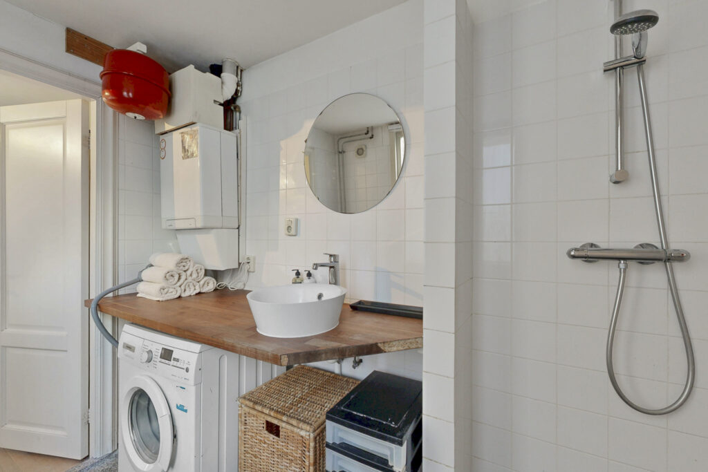 Aan de achterzijde bevindt zich de ruime slaapkamer. Hier slaap je heerlijk rustig en heb je voldoende ruimte voor een tweepersoonsbed en een kastenwand. De badkamer is ensuite en verrassend ruim. Je vindt hier een fijne inloopdouche, ruimte voor de wasmachine en eventueel een droger, en het toilet.