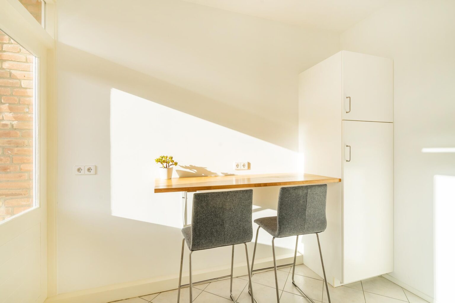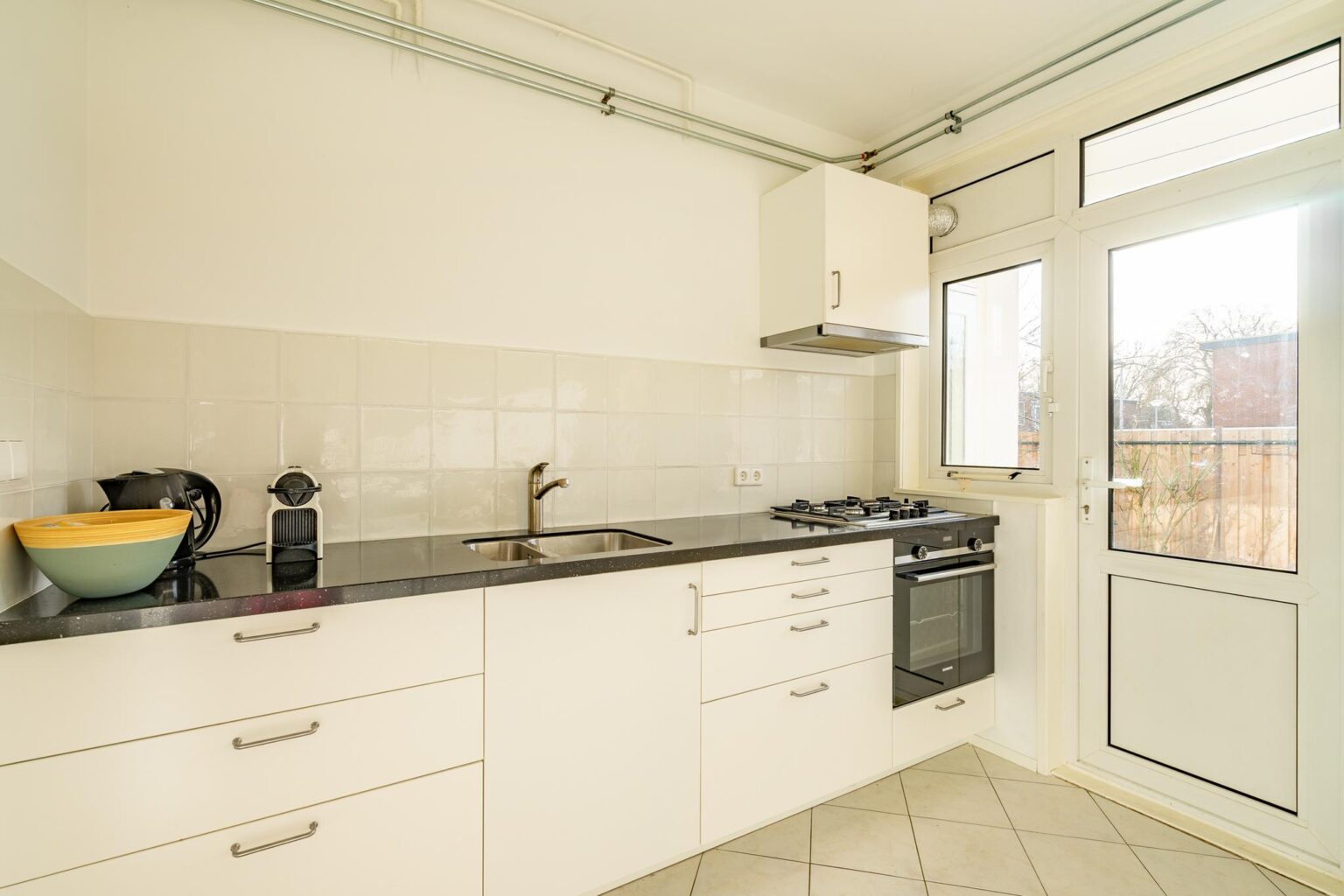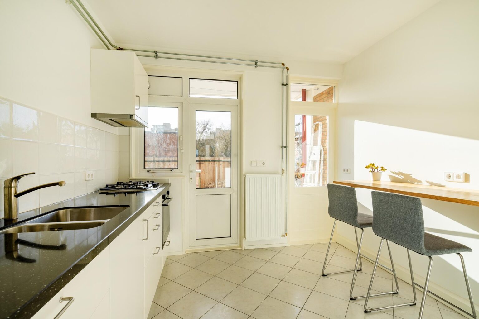 De leef-keuken is een heerlijke ruimte in huis. Veel licht en toegang tot de tuin op het zuiden. De keuken is verder voorzien van diverse inbouwapparatuur waaronder een 4-pits-gasfornuis, combi-oven, afzuigkap en koelkast met vriezer.