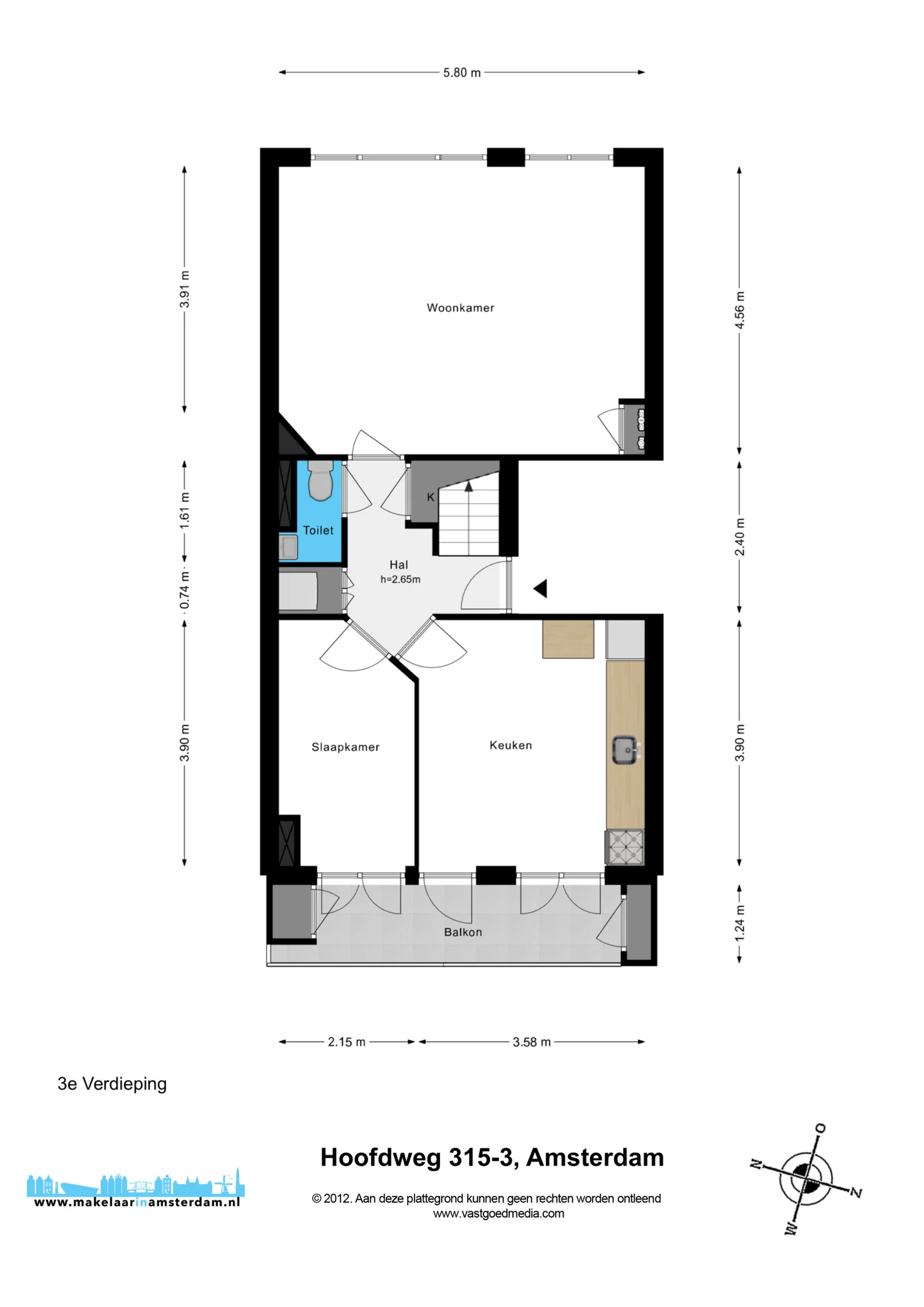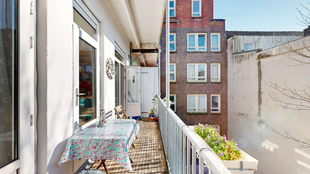 Op de derde verdieping bevinden zich aan de achterzijde de gezellige woonkeuken met toegang tot het balkon. Dankzij de drie openslaande deuren is er een mooie verbinding tussen binnen en buiten. Het balkon is over de gehele breedte van de woning gesitueerd en ligt ideaal op het westen.