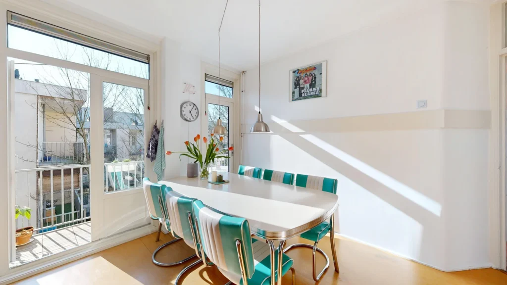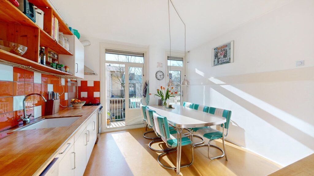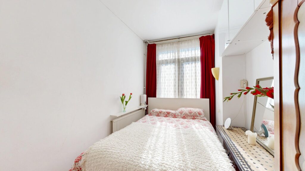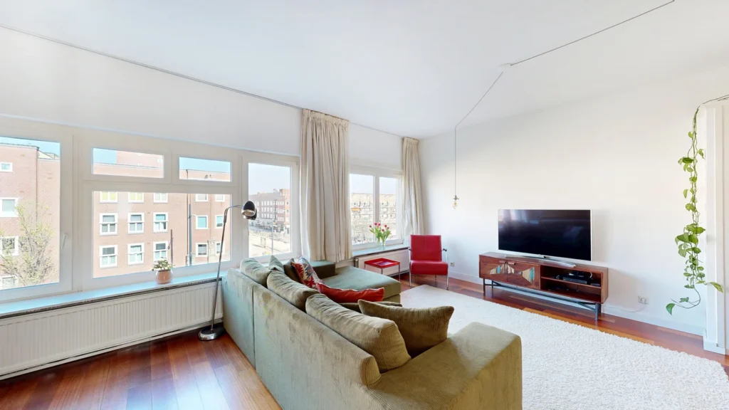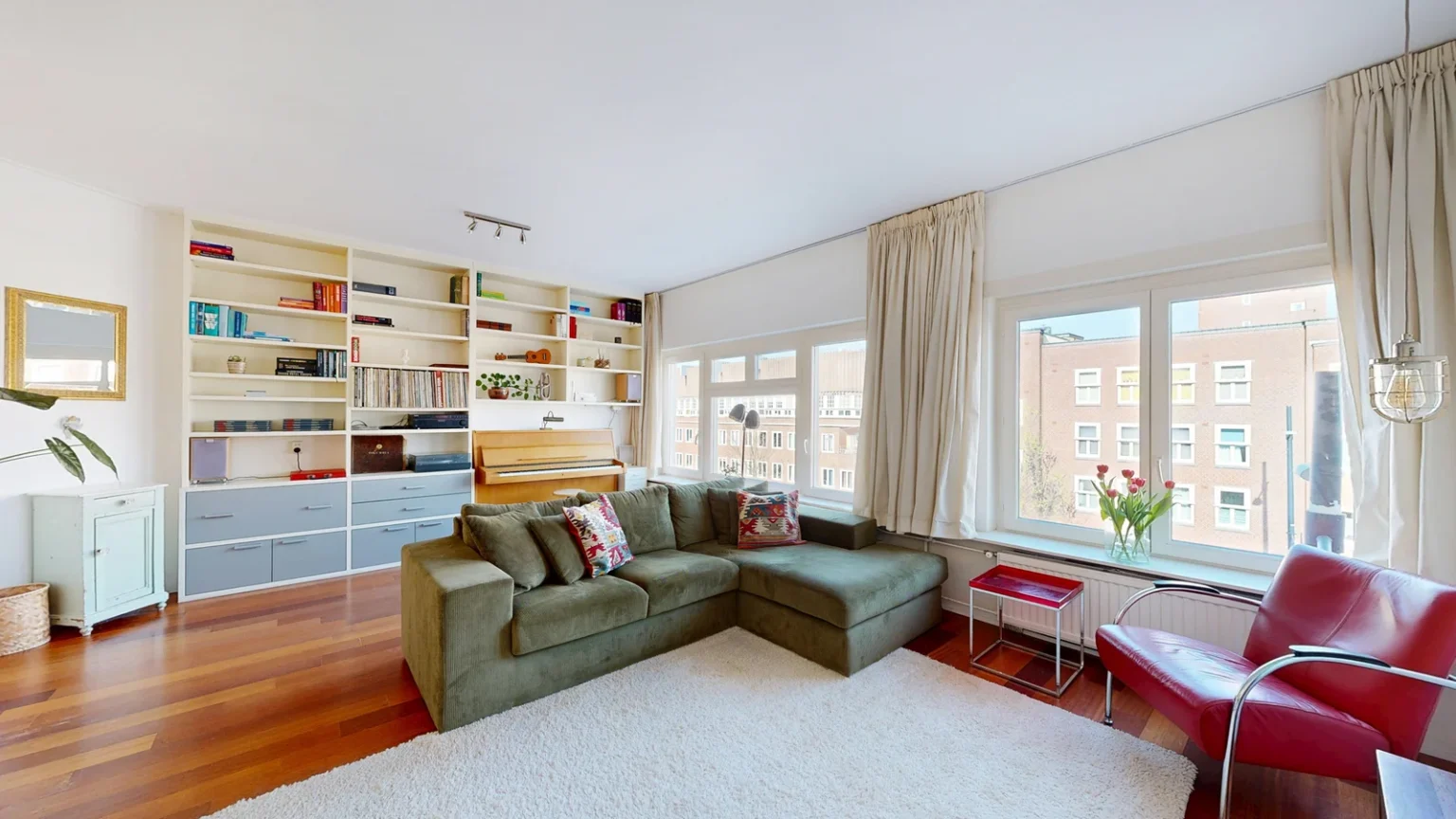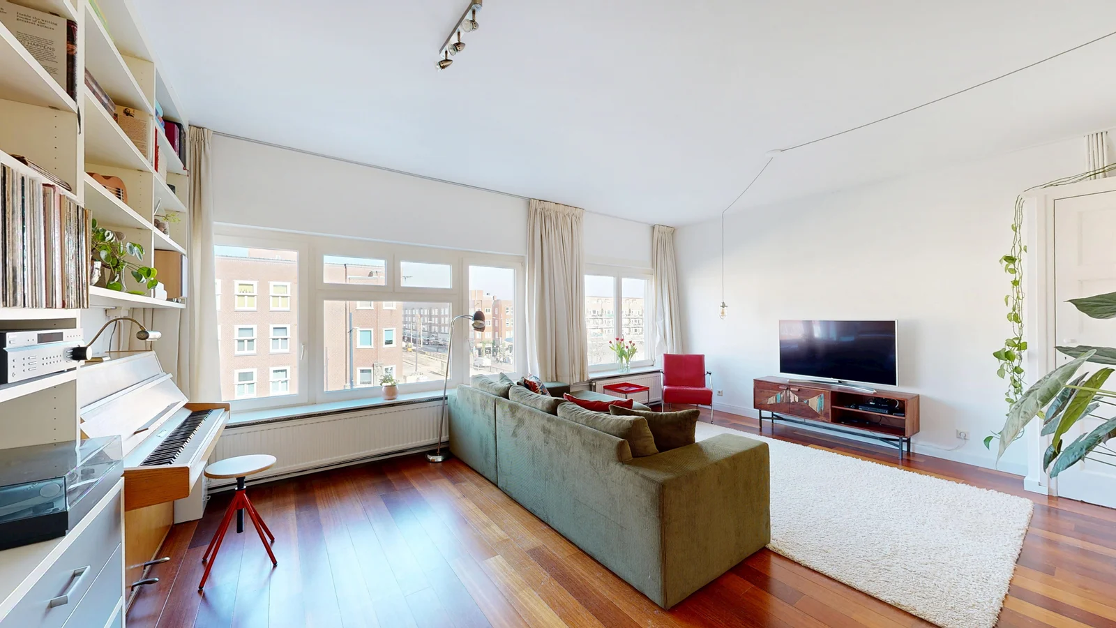 Aan de voorzijde ligt de woonkamer: een brede, lichte ruimte met een vrij uitzicht over het altijd levendige Mercatorplein. De prettige, rechthoekige ruimte is strak gestuukt en biedt mogelijkheden voor een flexibele indeling. Dubbele geïsoleerde ramen houden de geluiden van het verkeer buiten en zorgen voor een prettige rust in huis.