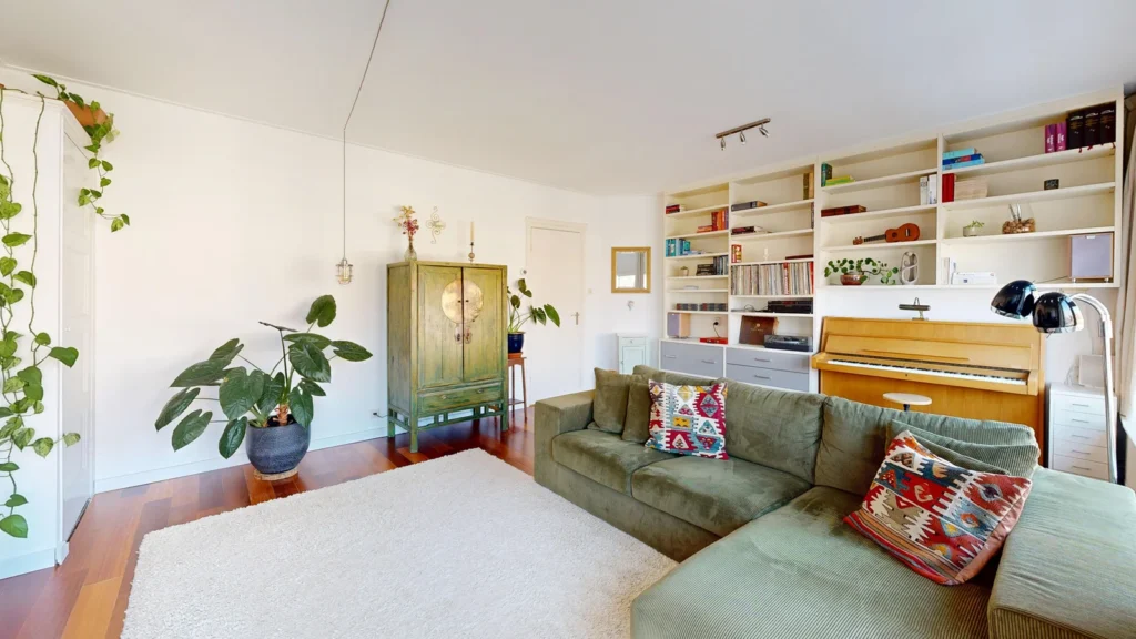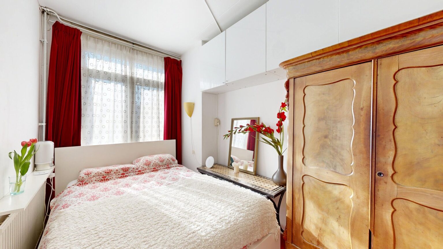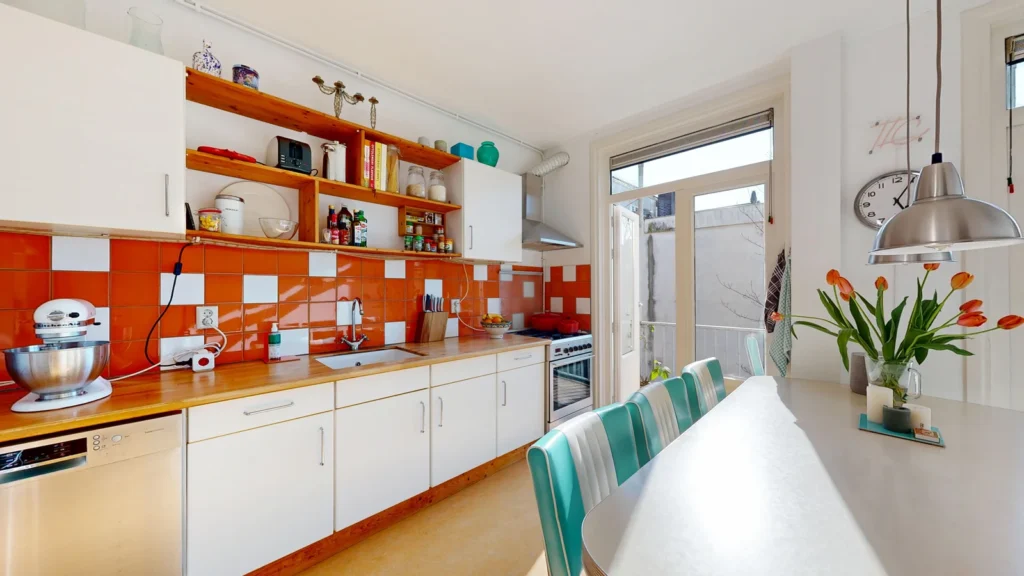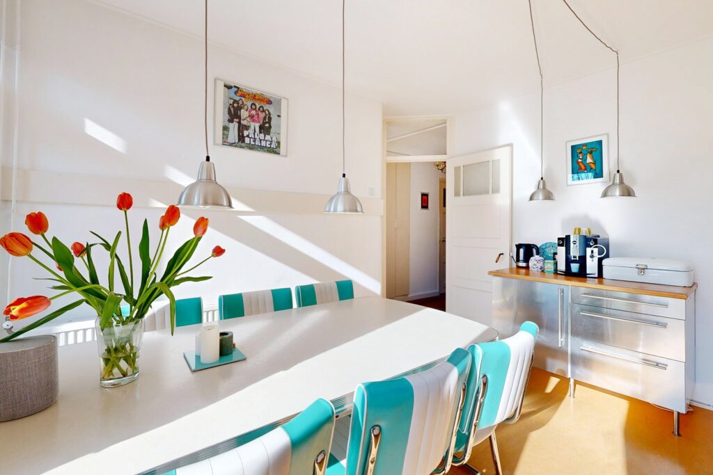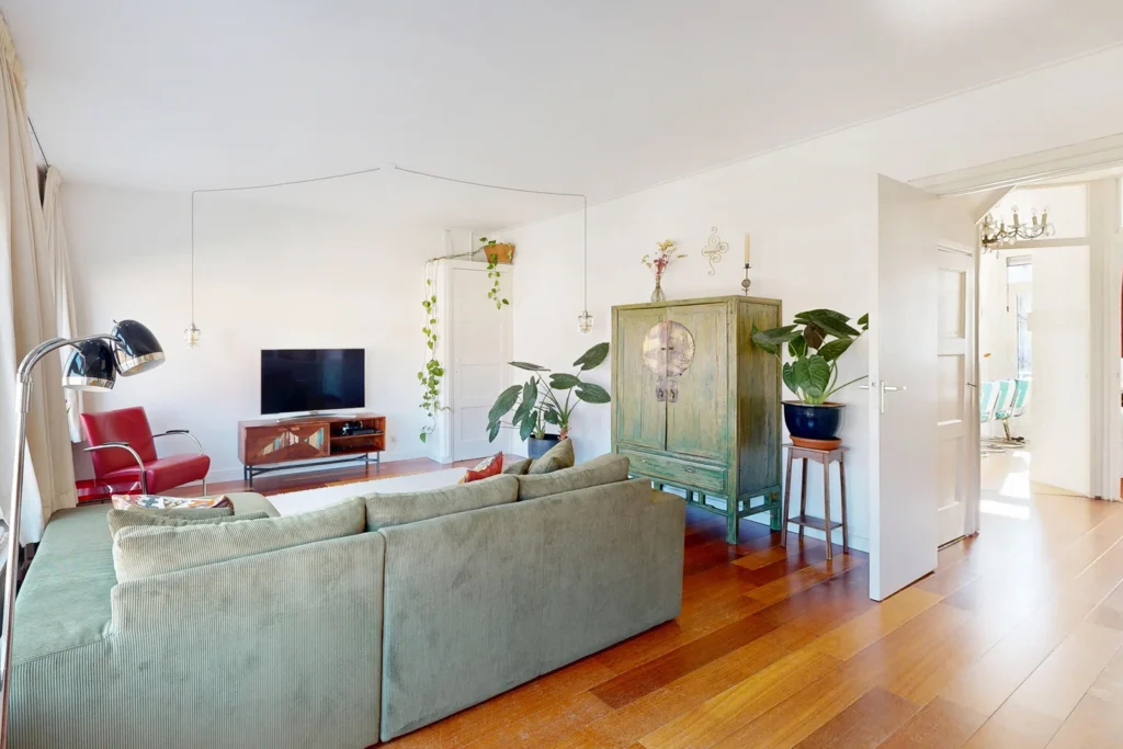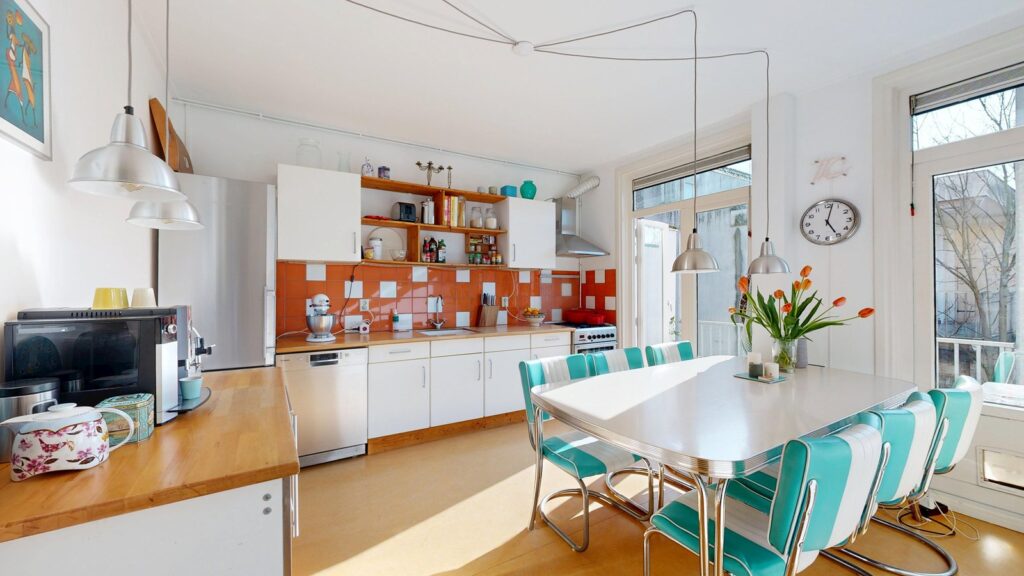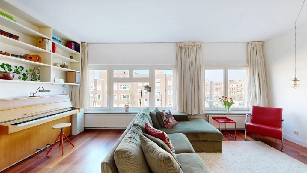 Aan de voorzijde ligt de woonkamer: een brede, lichte ruimte met een vrij uitzicht over het altijd levendige Mercatorplein. De prettige, rechthoekige ruimte is strak gestuukt en biedt mogelijkheden voor een flexibele indeling. Dubbele geïsoleerde ramen houden de geluiden van het verkeer buiten en zorgen voor een prettige rust in huis.