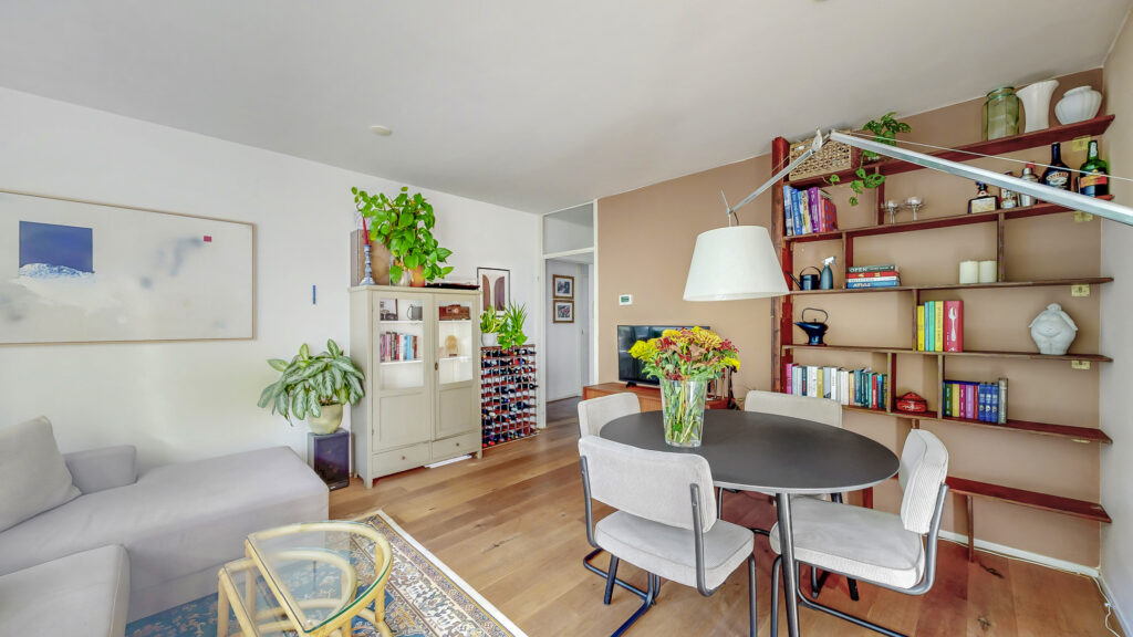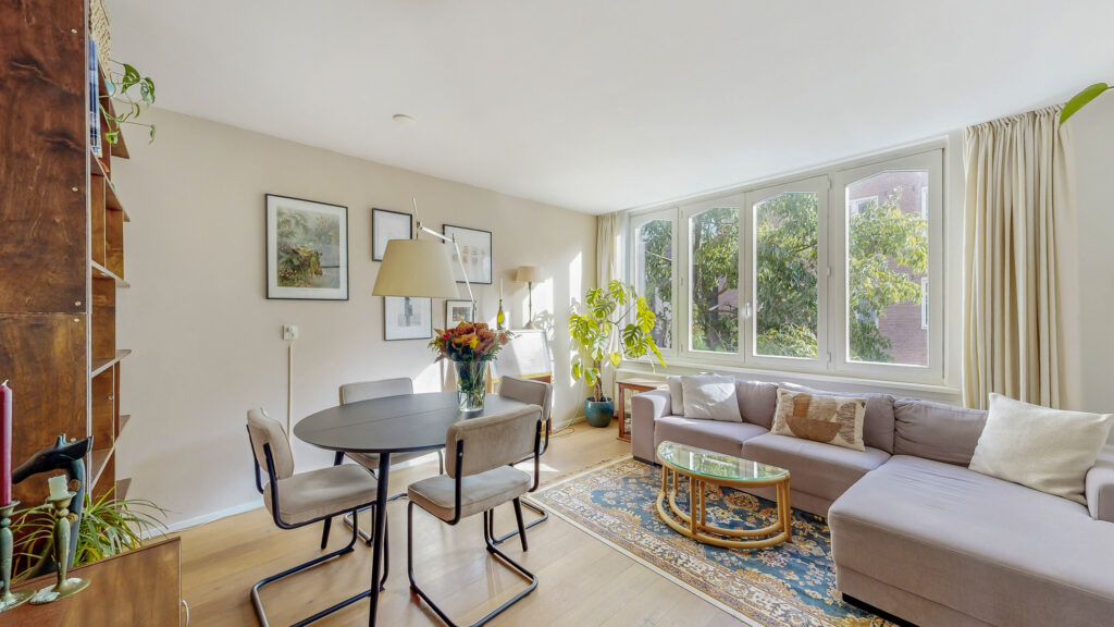 Het appartement ligt op de tweede verdieping. Bij binnenkomst kom je in de hal met toegang tot de verschillende vertrekken. Aan de voorzijde bevindt zich de lichte woonkamer met een prettige sfeer en veel daglicht.