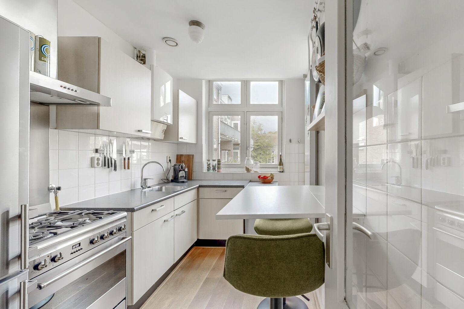 De keuken is ruim opgezet, met plek voor een ontbijttafel of bar, en is voorzien van een Smeg 4-pits gasfornuis, afzuigkap, koelkast met vriezer en een vaatwasser.