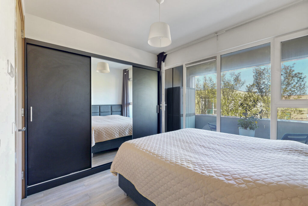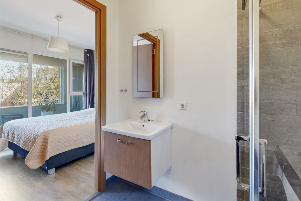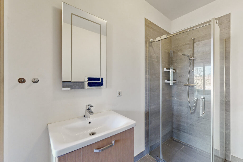 De slaapkamer is ruim genoeg voor een groot bed en een goede kastenwand. De badkamer is strak afgewerkt en compleet, met een douche, wastafelmeubel, toilet en aansluiting voor de wasmachine.
