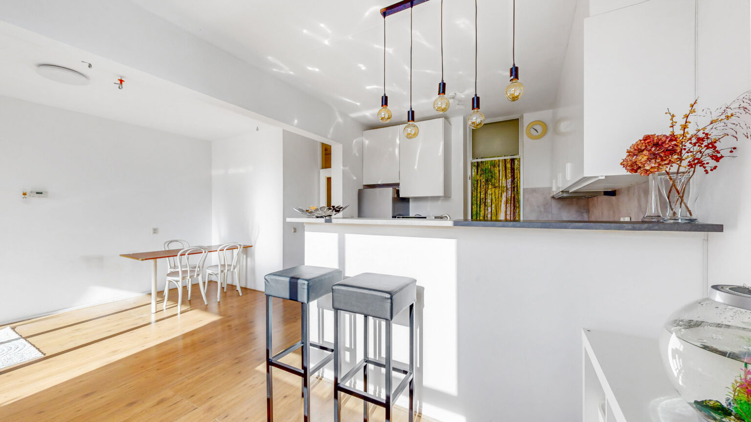 – lichte woonkamer met open keuken en aangrenzend balkon