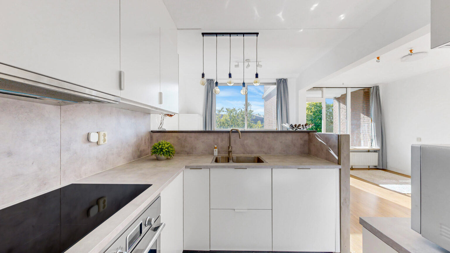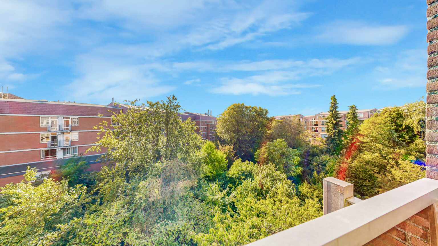 Op de woonverdieping wacht een lichte woonkamer met open keuken. Dankzij de grote ramen valt de zon rijkelijk naar binnen en heb je een fijn uitzicht op het groen. De moderne keuken met gezellige bar biedt veel werk- en opbergruimte en is uitgerust met een dubbele spoelbak, inductiefkokplaat, afzuigkap, oven, aparte magnetron en een koel-/vriescombinatie. Extra praktisch is de inpandige bergkast, ideaal als voorraadruimte. Vanuit de woonkamer stap je zo het balkon op, gelegen op het zuidwesten: een heerlijke plek voor een drankje in de middag- of avondzon.