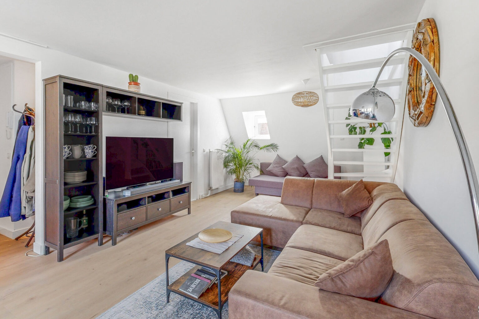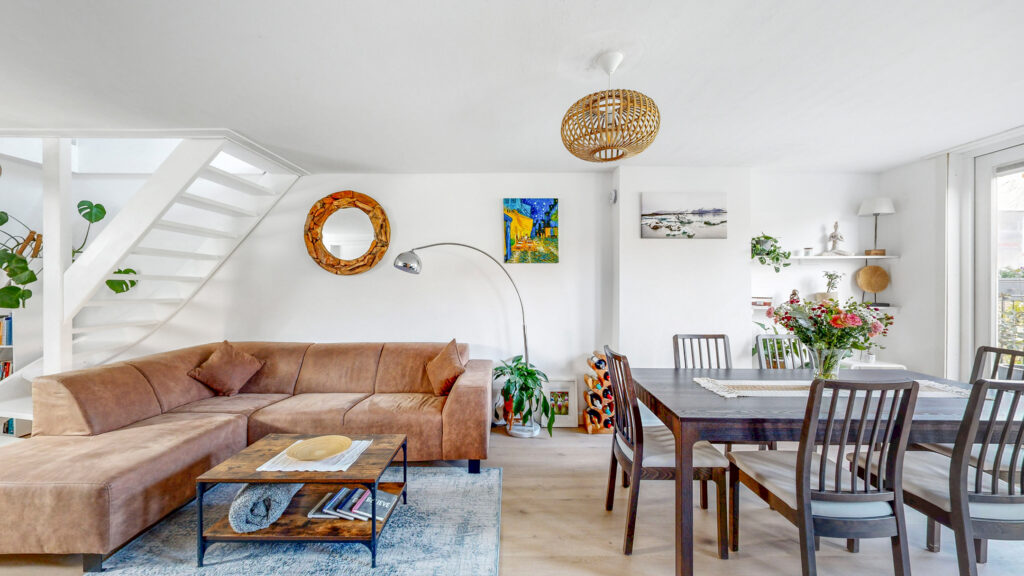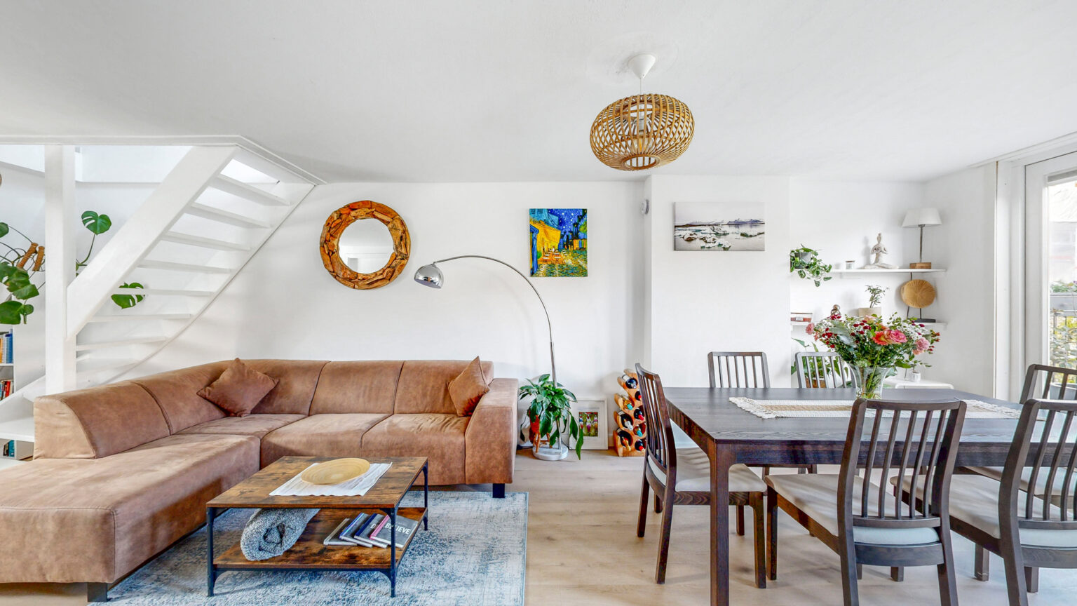 De woonverdieping is licht en ruim opgezet, met glad gestuukte wanden en een nieuwe pvc-vloer. De woonkamer grenst direct aan het eerste terras, gelegen op het oosten, een heerlijke plek voor ontbijt in de zon.