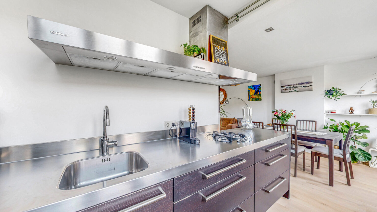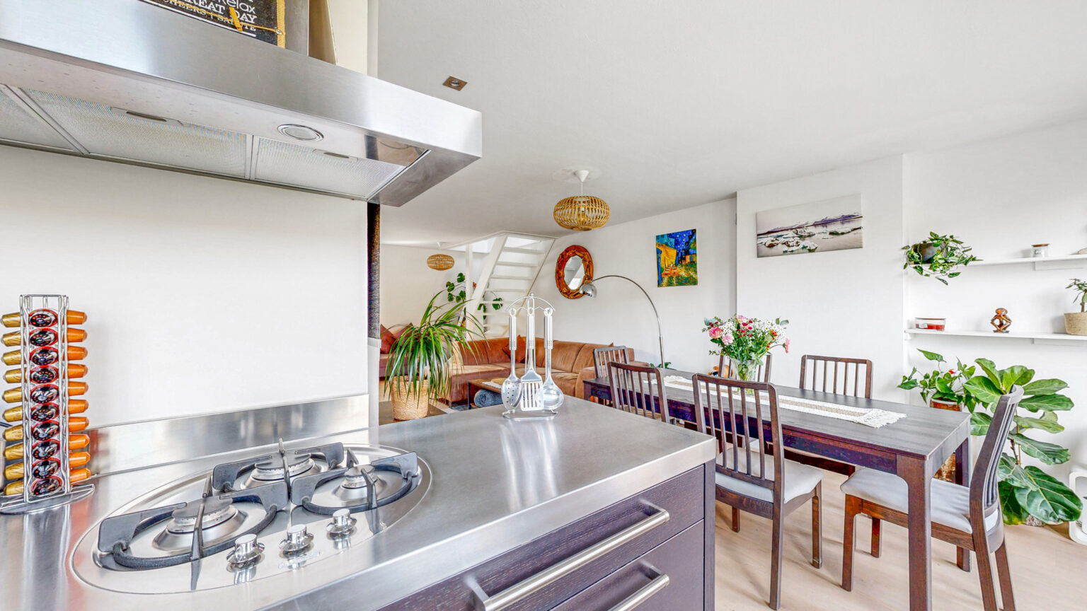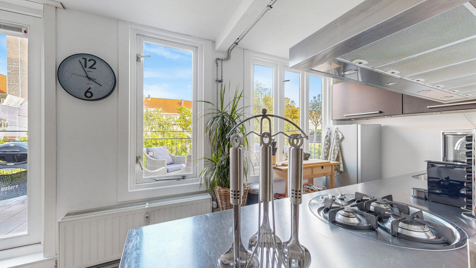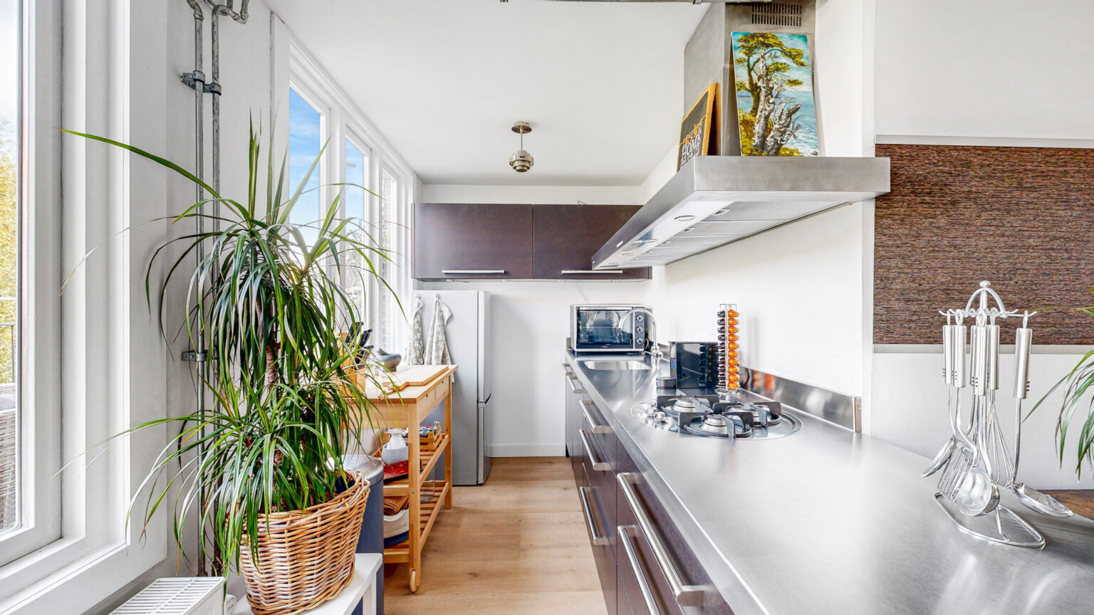 De open keuken heeft een slimme indeling en naast veel werk- en opbergruimte beschikt de keuken over een 3-pits kookplaat die geïntegreerd is in het keukenblad, brede afzuigkap, vaatwasser en een losse koel-/vriescombinatie.