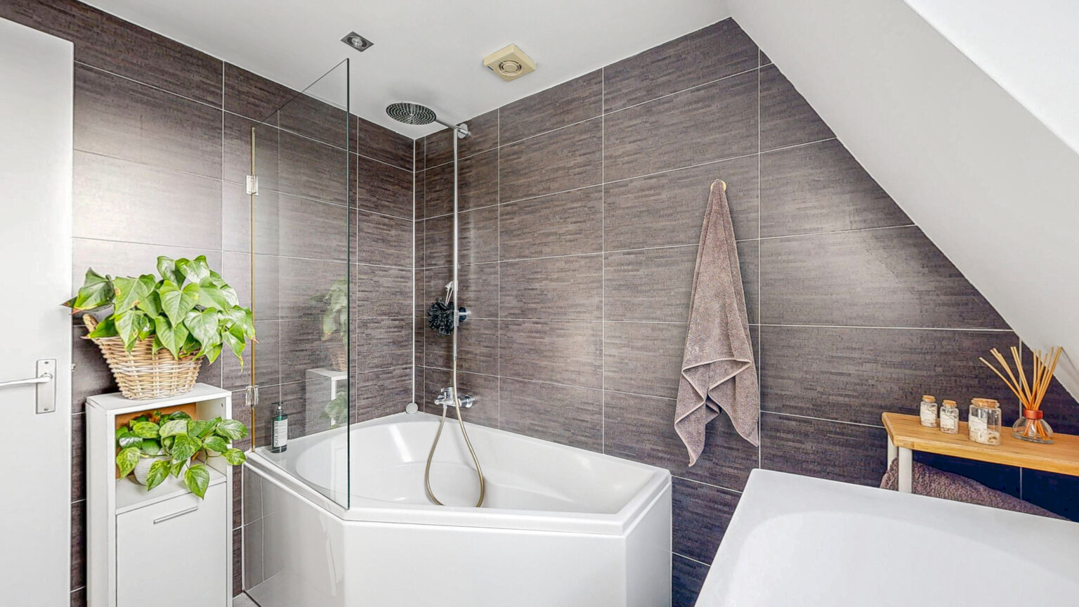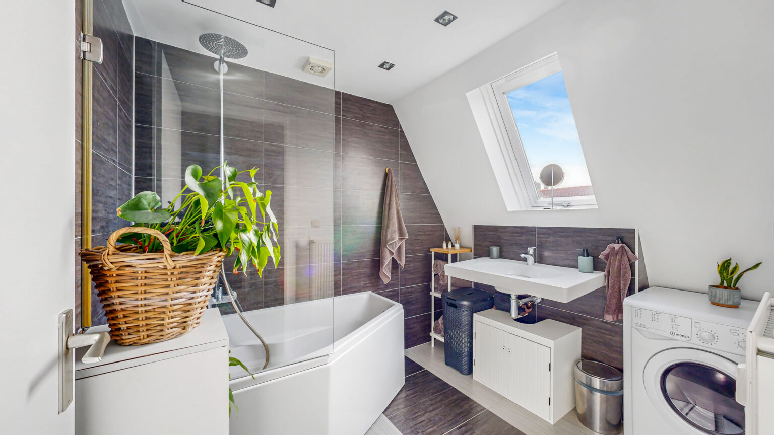De prettige badkamer is voorzien van een ligbad, wastafel, daglicht vanwege het raam, inbouwspots en een wasmachine-aansluiting.