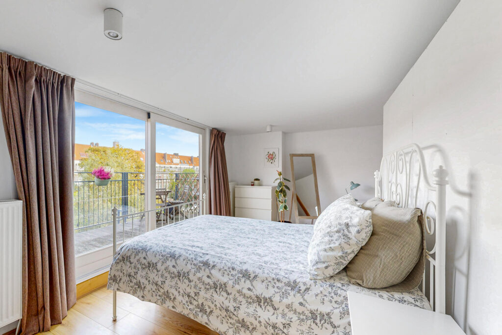 De bovenste verdieping (uitgebouwd in 2017) verrast met een royale slaapkamer, voorzien van veel lichtinval en toegang tot het tweede terras. Door de gunstige ligging kun je hier lang genieten van de zon.
