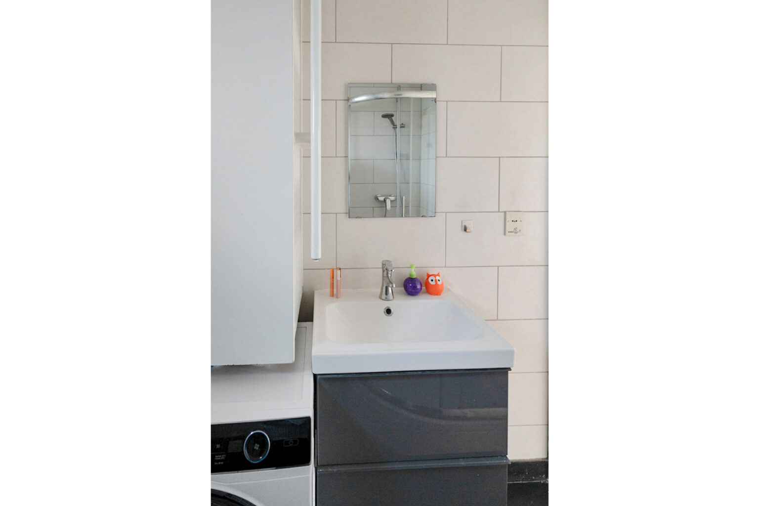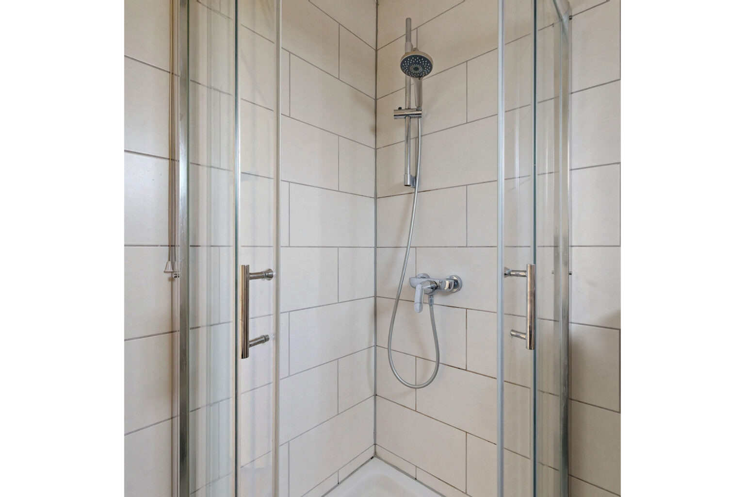 De badkamer is netjes afgewerkt met grote witte wandtegels en een donkere vloertegel. Je vindt hier een douche, toilet, wastafelmeubel, designradiator en de aansluiting voor de wasmachine.