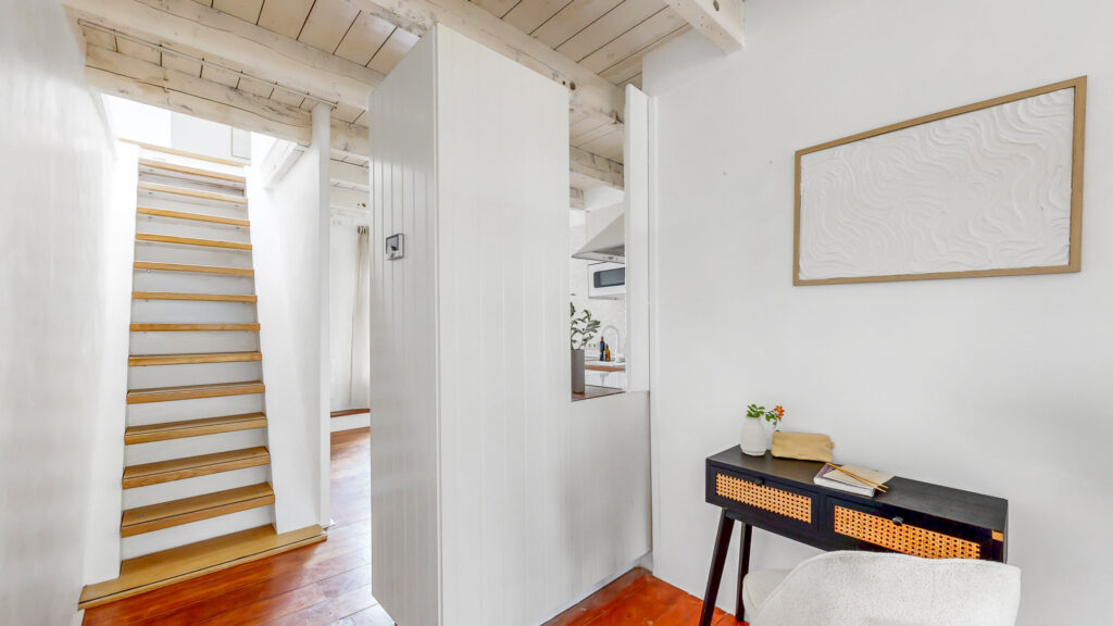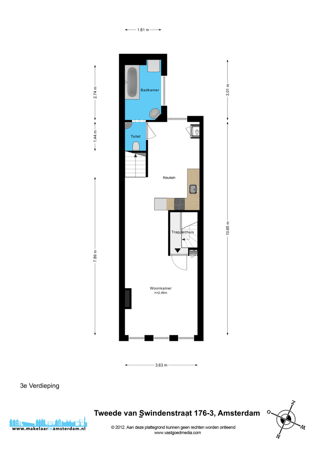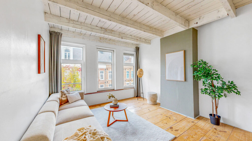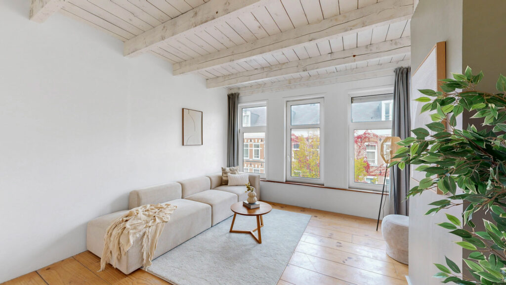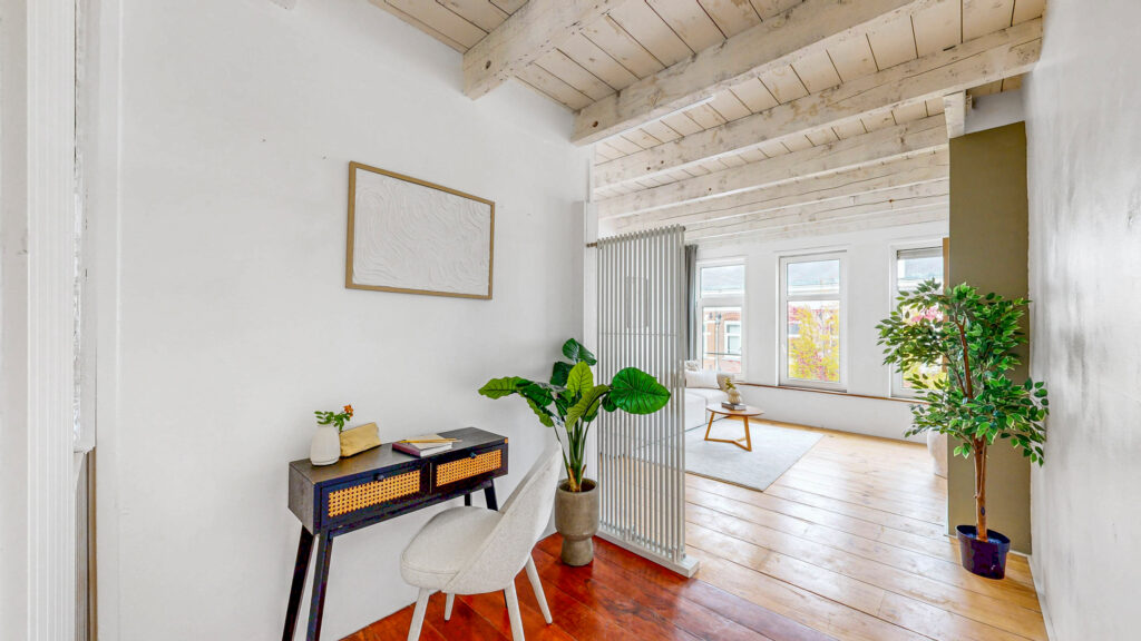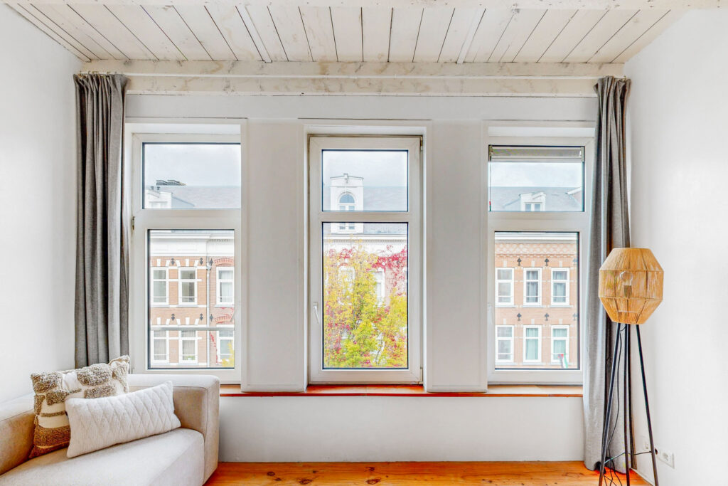 Via het Amsterdamse trappenhuis bereik je de derde verdieping. Aan de voorzijde bevindt zich de lichte woonkamer met uitzicht over de rustige straat. In het midden van de woning is een ideale plek gecreëerd voor een thuiswerkplek. Het fraaie balkenplafond geeft de woning veel sfeer.