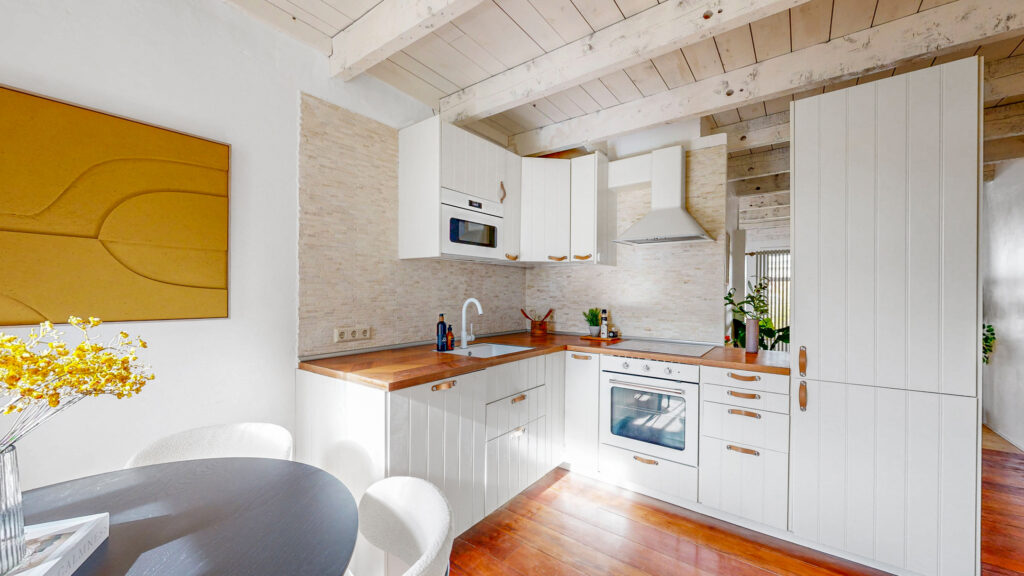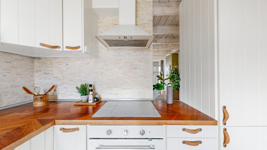 Aan de achterzijde vind je de open keuken uit 2020, voorzien van veel werk- en opbergruimte en diverse inbouwapparatuur, waaronder een koelkast met vriezer (drie lades), een inductiekookplaat, afzuigkap, oven, separate magnetron en een vaatwasser.