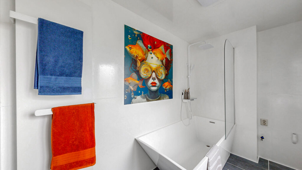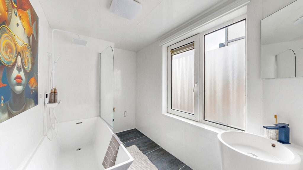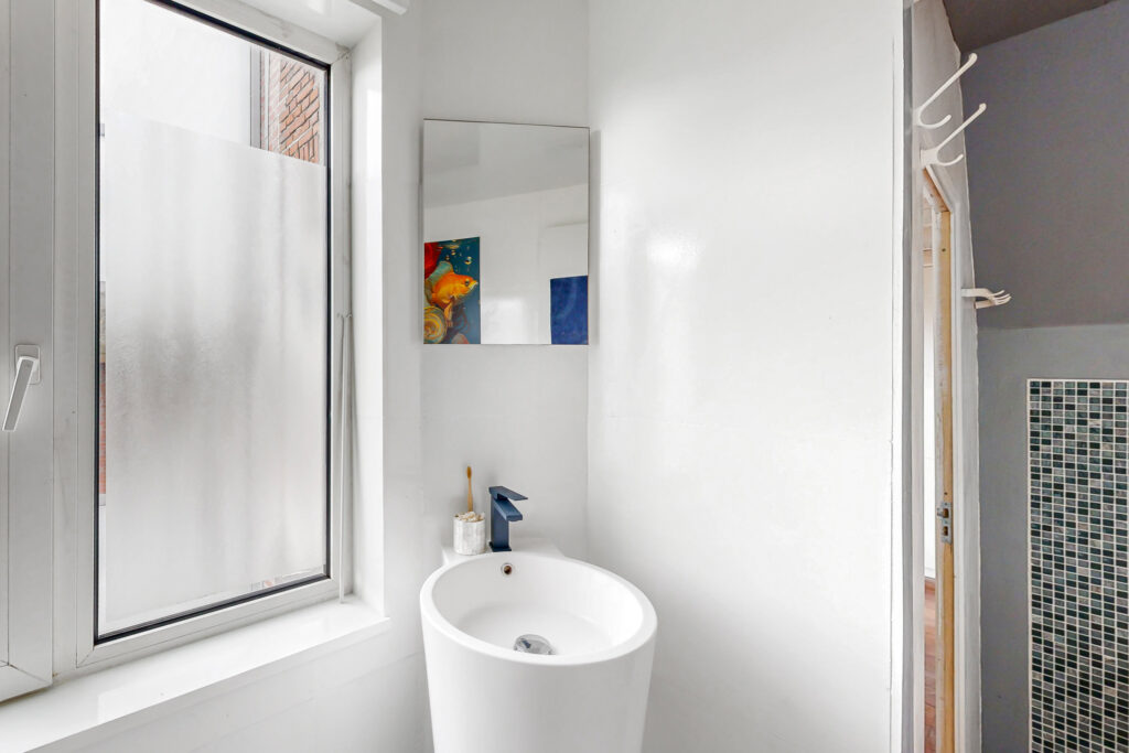 De vernieuwde badkamer is netjes afgewerkt met een antracietkleurige vloer voor een luxe uitstraling. De badkamer is voorzien van een toilet, ligbad met douche, aansluiting voor de wasmachine en een wastafel. Dankzij het raam is er extra daglicht en natuurlijke ventilatie.