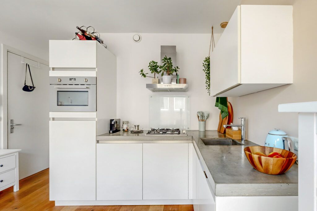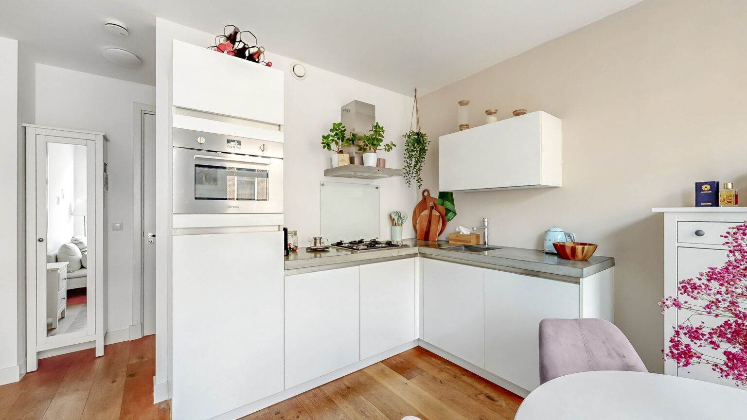 The kitchen has a cool concrete countertop, matte white handleless cabinets and is equipped with all the necessary built-in appliances: a dishwasher, 4-burner gas hob, extractor hood, refrigerator with freezer and a combination oven/microwave.