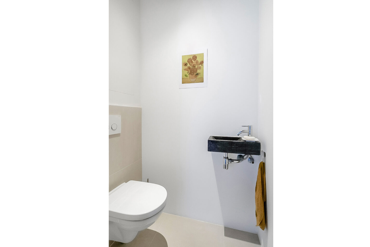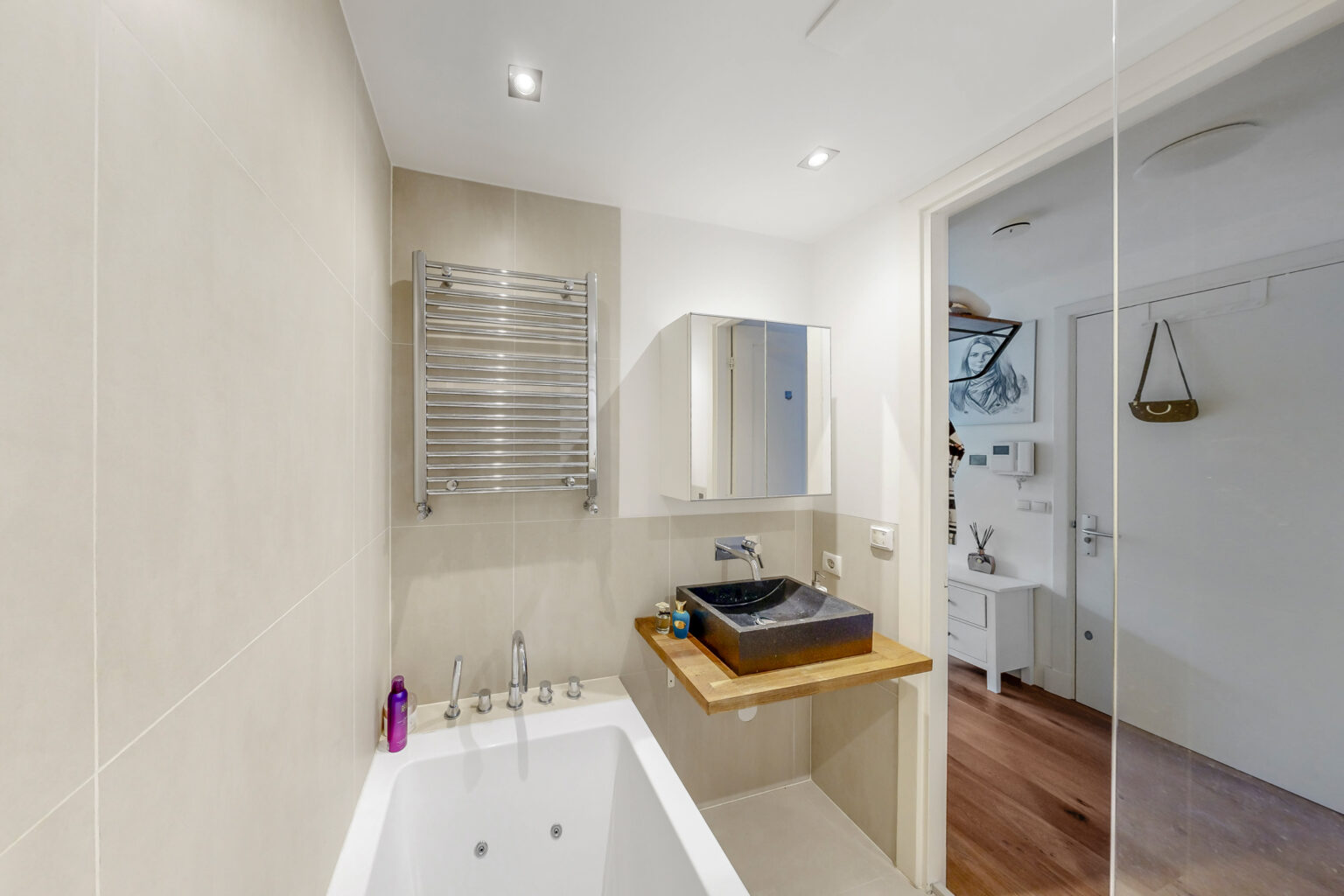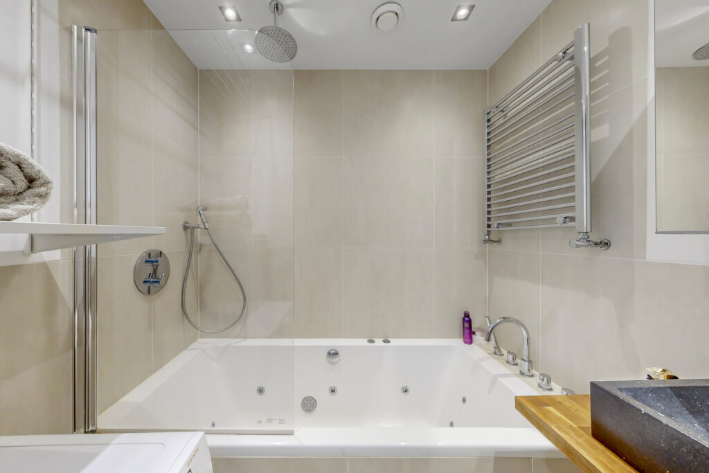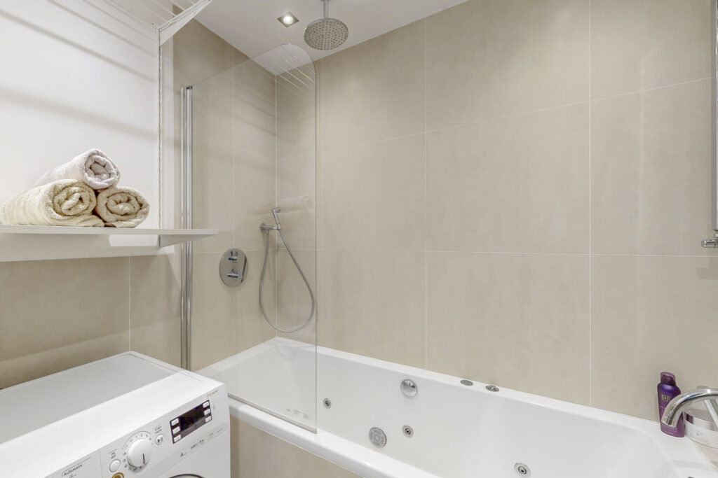The bathroom has the luxurious look of a boutique hotel: modern, bright and equipped with a whirlpool bathtub, shower, beautiful washbasin and plumbing for a washing machine. The toilet is separate and equipped with a free hanging toilet and sink.