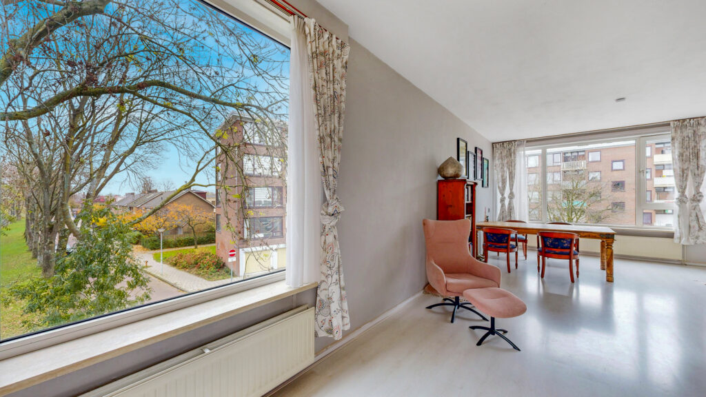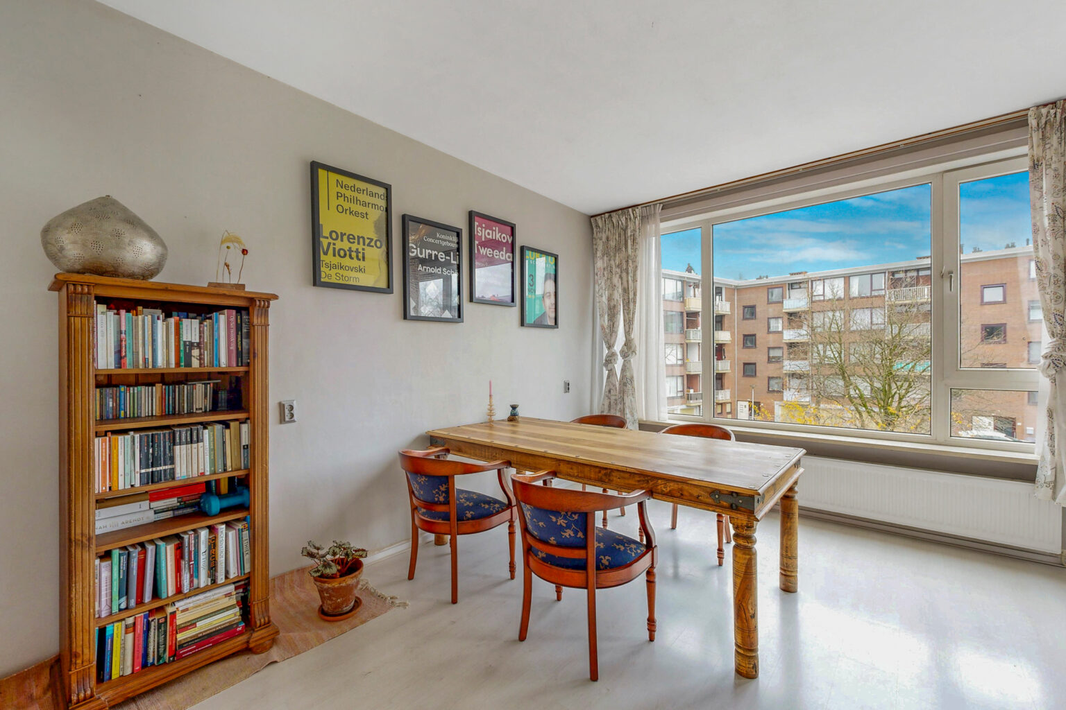 The cozy and spacious living room stands out because of the many light which falls in beautifully and the unobstructed view over the courtyard and greenery. The first balcony can be reached through the living room and is located on the south. Here you can enjoy the sun almost all day.