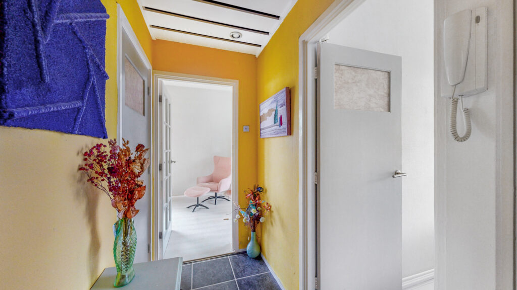 You enter on the second floor through the neat staircase. The hall in the house gives access to all rooms.