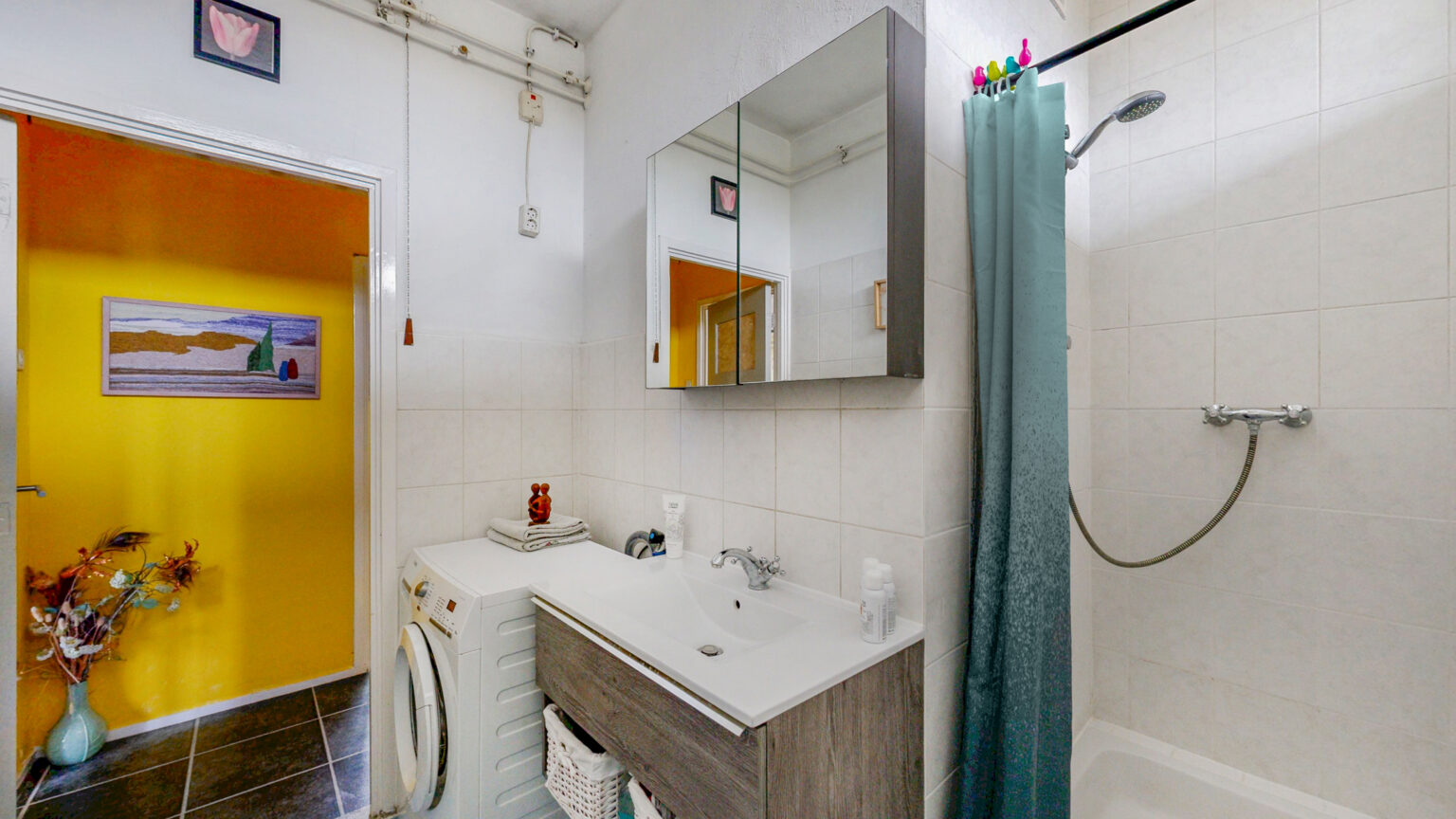 The bathroom is neat and equipped with a walk-in shower, sink cabinet and towel radiator. The toilet is separate.