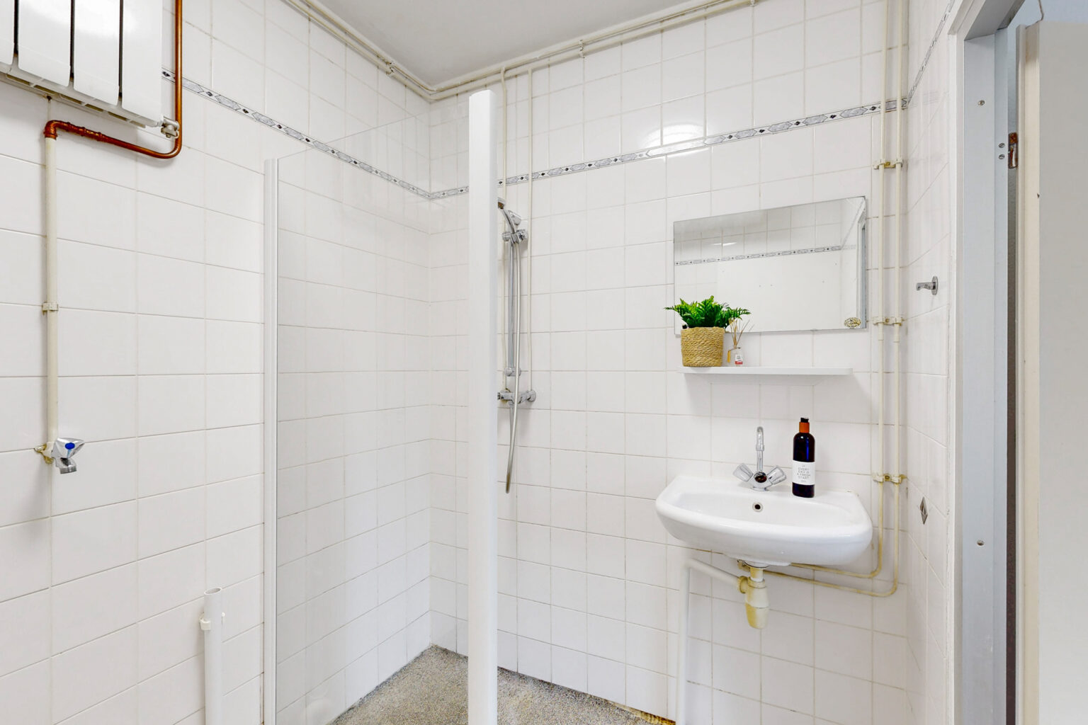 There are two spacious bedrooms, one with direct access to the bathroom (ensuite). The bathroom has a sink, shower and connection for the washing machine. The toilet is separate.