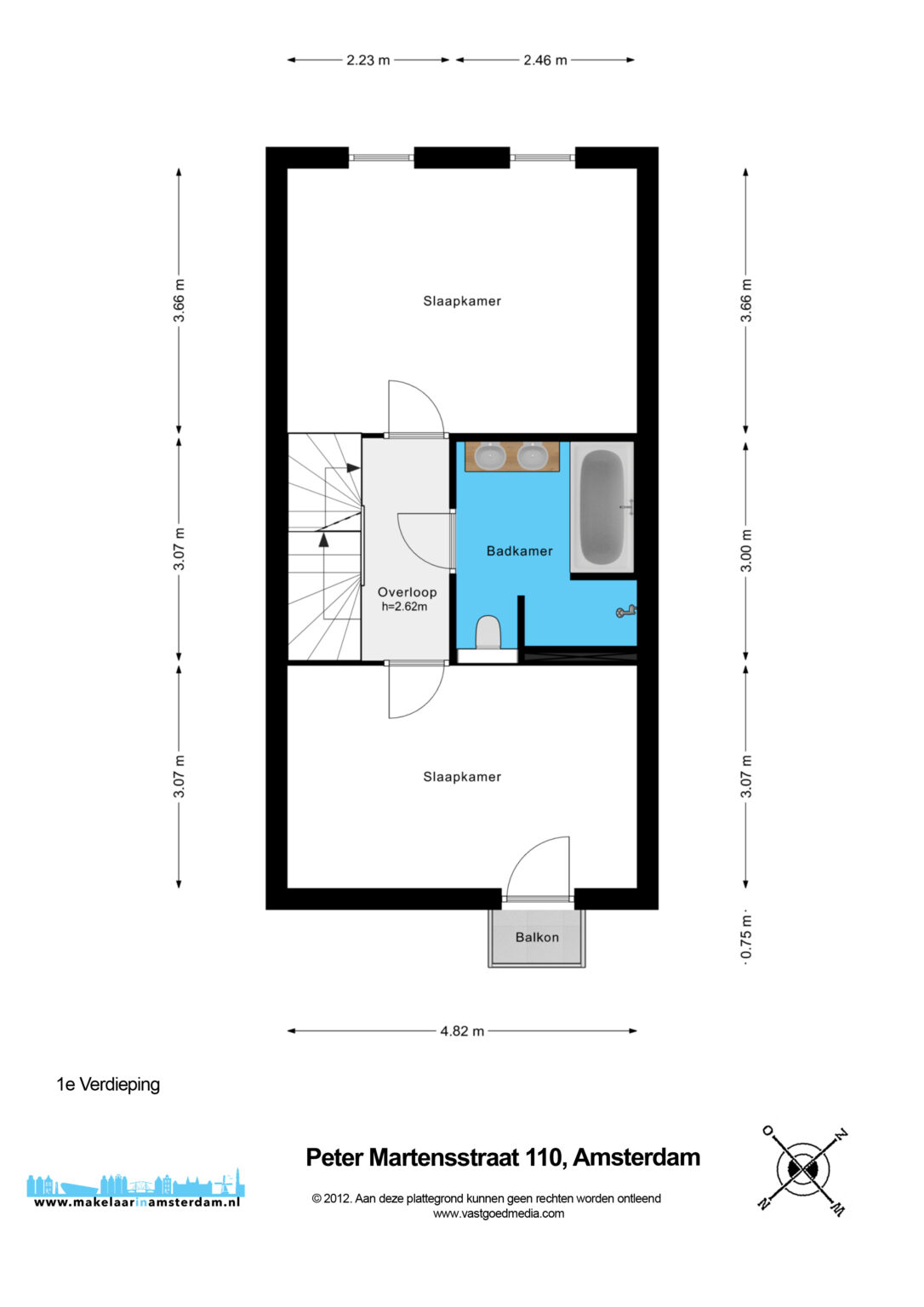 The second floor is tightly finished with plastered walls, a cast floor and underfloor heating. At the rear is the spacious master bedroom. At the front is a second spacious bedroom with French balcony. The bathroom is spacious and stylish and features a bathtub, walk-in shower, second toilet and a washbasin.