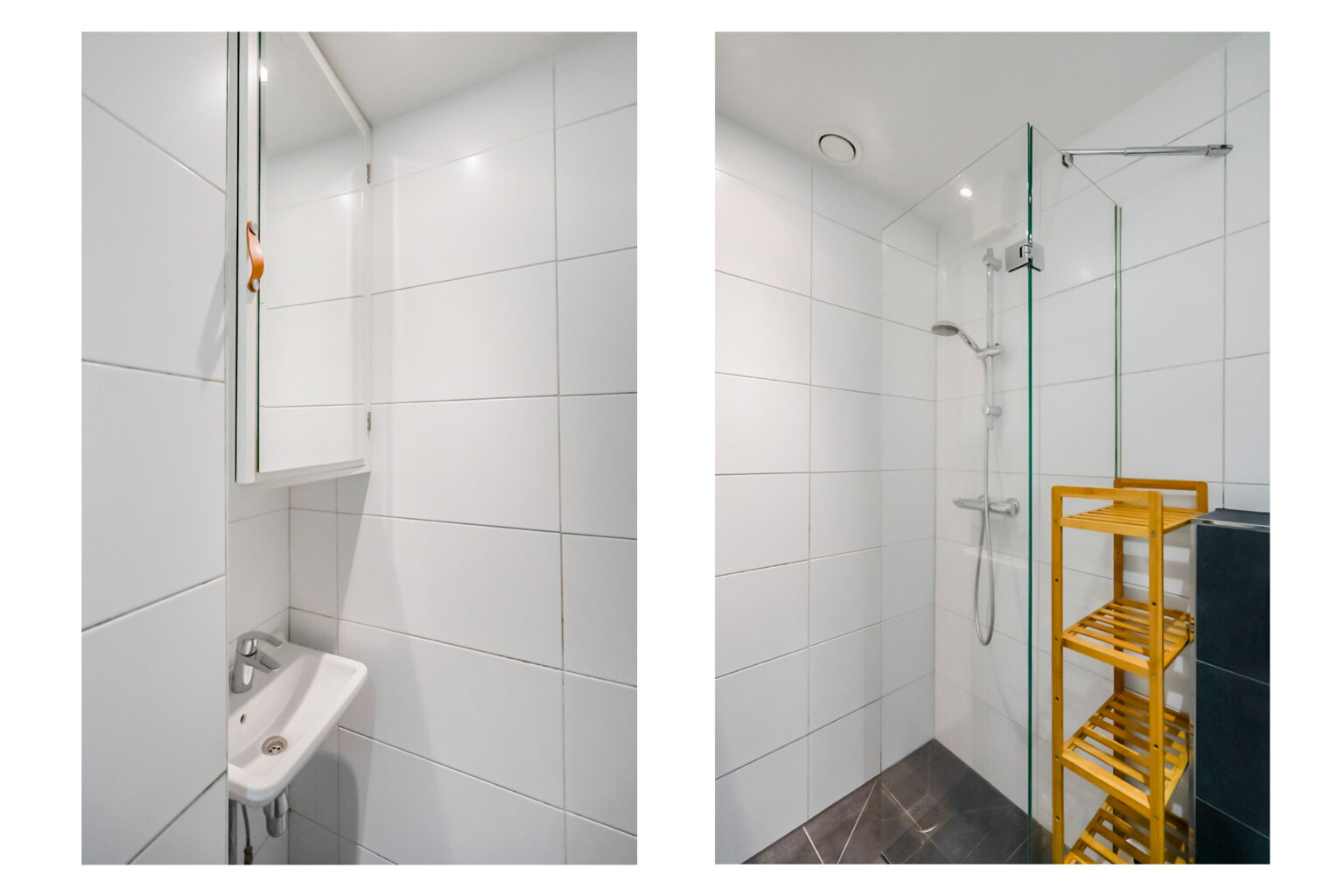 The spacious bedroom at the quiet front has a practical built-in closet. In addition to a double bed, there is ample space for additional closet space.The bathroom is modern in finish with large white wall tiles and anthracite-colored floor tiles, and features a shower, sink with cabinet, toilet and radiator.There is no shortage of storage space either. In addition to the various storage options in the home itself, there is an additional private storage room with natural light on the fourth floor.
