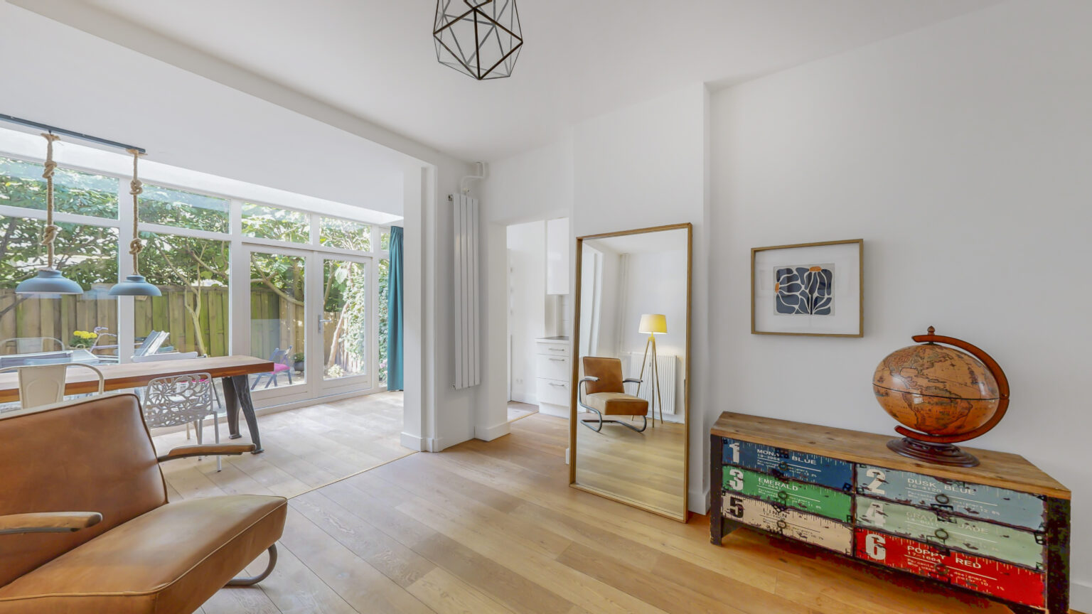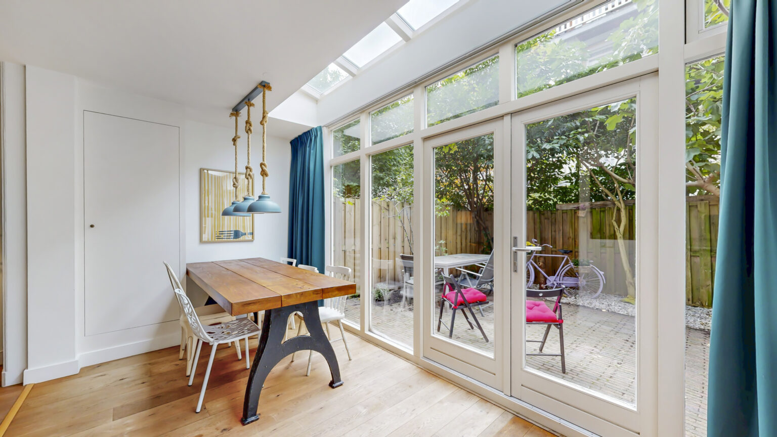 You enter through the hall with checkroom and meter cupboard. Then you step into the spacious living room, where the light falls beautifully inside through the wide extension. Thanks to the six windows and the skylight, this is a particularly pleasant place in the house. There is more than enough home for a home office or even to create a second bedroom.