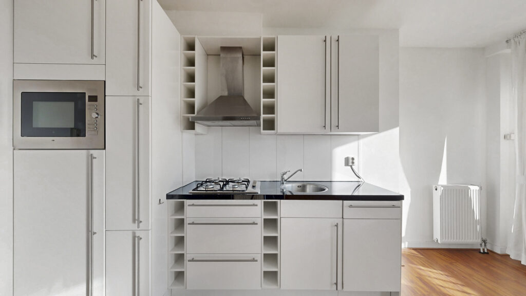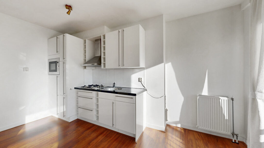 De open keuken is uitgevoerd met hoogglans wit frontjes en een zwart stenen aanrechtblad. Verder voorzien van combi oven magnetron, koelkast met vriesvak, 4-pits gasfornuis, afzuigkap, vaatwasser en veel kastruimte.