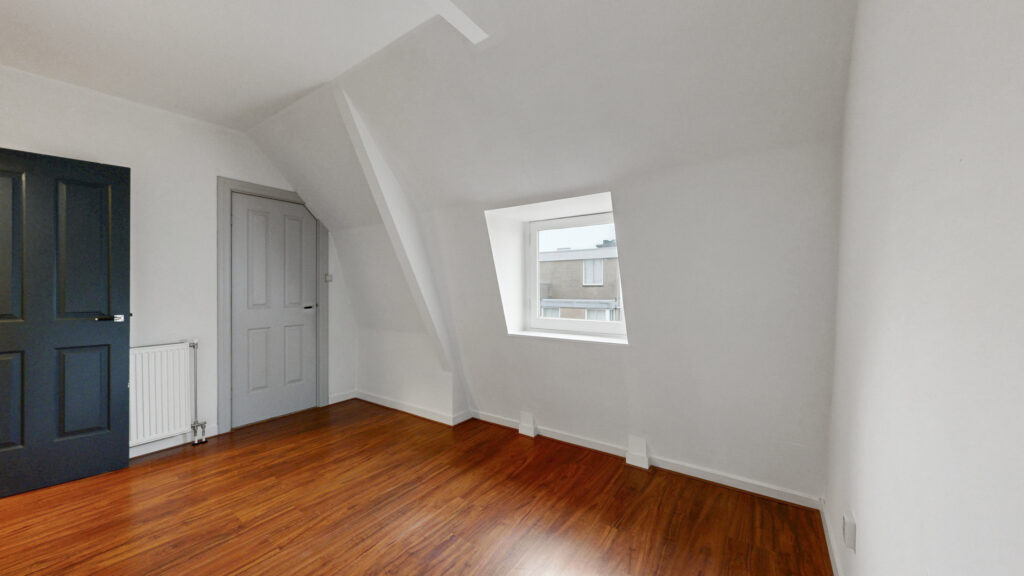 Aan de voorzijde van de woning ligt de ruime slaapkamer. Meer dan ruim genoeg voor een tweepersoonsbed en een grote kastenwand. Vanuit de slaapkamer heb je toegang tot een inpandige berging met wasmachineaansluiting en ruimte voor een droger. Hier hangt ook de Intergas cv-ketel uit 2021.